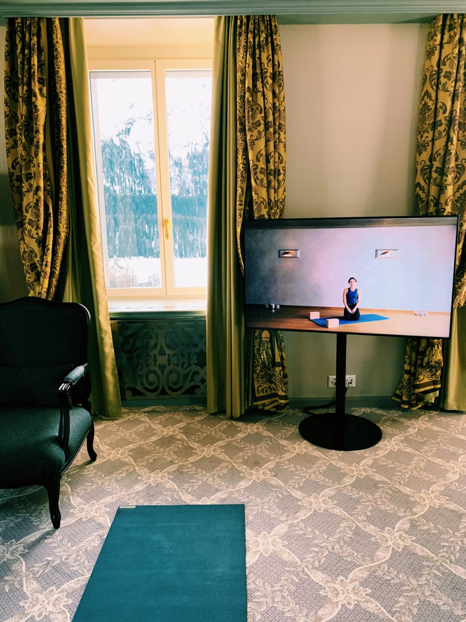 Das war mein Highlight: Das Hotel verliess ich bei so viel Komfort nur höchst ungern, doch die Einladung zum Eisbaden im St. Moritzersee wollte ich trotz anfänglicher Skepsis nicht ausschlagen: Unsere sehr freundliche und hilfsbereite Instruktorin Tanja zeigte uns Atemübungen, bevor wir uns ins Eisloch wagten. Lange hielt ich es im eisigkalten Wasser zwar nicht aus, aber die Erfahrung hat grossen Spass gemacht. Ein weiteres Highlight: eine Lektion Morning Yoga mit Sicht aufs Bergpanorama. Und weil wir gar nicht genug vom Vinyasa-Flow kriegten, probierten wir in der Suite gleich noch das hoteleigene Trainingsprogramm via Bildschirm aus.