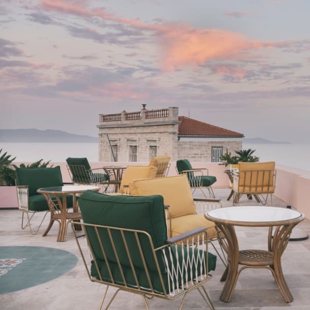 Es scheint, als lagerten auf der Dachterrasse unsichtbare Magnete – jedenfalls fühlt man sich beim Betreten des "Aristide" fast zwanghaft angezogen von der Rooftopbar mit Blick über die Ägäis. Es empfiehlt sich, hier oben mindestens einen der Signature-Cocktails zu sippen, wie etwa einen Pan & Dora mit dem frischesten Bergamotte-Gurken-Sirup, den ein Zitronentonic je gesehen hat. Danach bitte zum Erkundungsgang durch das aufwendig renovierte Herrenhaus in Ermoupoli, der Hauptstadt von Syros, starten: Die neoklassizistische Architektur und das Fingerspitzengefühl für Farbe sind das eine hier – zum anderen versteht man, warum das Haus als Künstler:innenresidenz gilt. Besuchende erwarten an nahezu jeder Ecke Gemälde oder stilvolle Dekorationen und ein kreatives Gastgeberinnen-Trio.