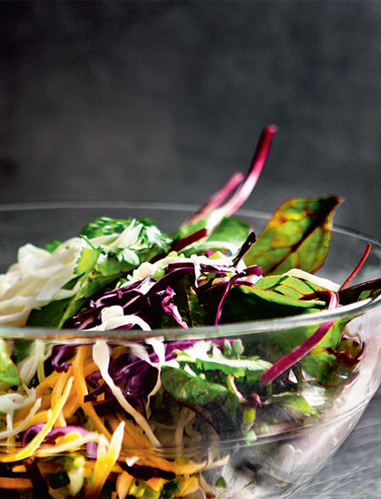 Der zweifarbige Kabissalat ist die Schnellversion, mit ebenso viel Vitamin A (aus Kohl, Chili und Zwiebelgrün), Vitamin C (aus Chili und Kohl), Kalium, Kalzium und Nahrungsfasern. Die prickelnde Schärfe des Ingwers passt perfekt und macht das manchmal so altbackene Gemüse modern.
