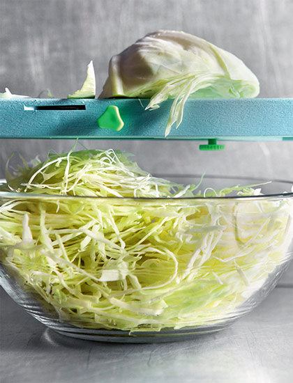 1. 2 Stunden im Voraus: Kabis separat hobeln, in eine grosse Schüssel
