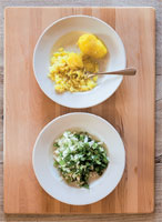 beifügen, mischen. Kartoffeln und Koriander dazugeben, salzen. Auskühlen lassen.