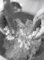 2. Teig: Öl zum Mehl geben. Mehl zwischen den Fingern reiben, bis das Öl gleichmässig vermischt ist. Wasser in Portionen dazugeben, rasch mischen. 5 Minuten kneten. Zugedeckt 30 Minuten ruhen lassen.