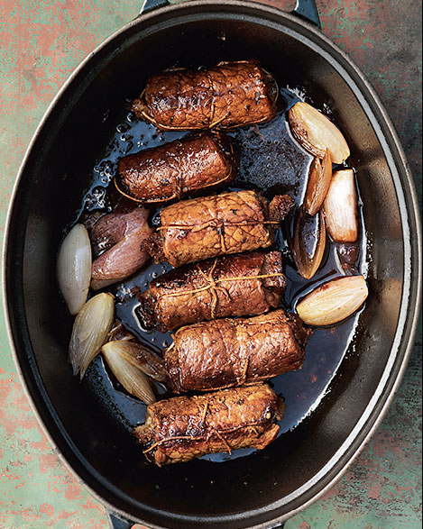 Die dünnen Fleischscheibchen sind mit einer Füllung aufgerollt und geschmort.