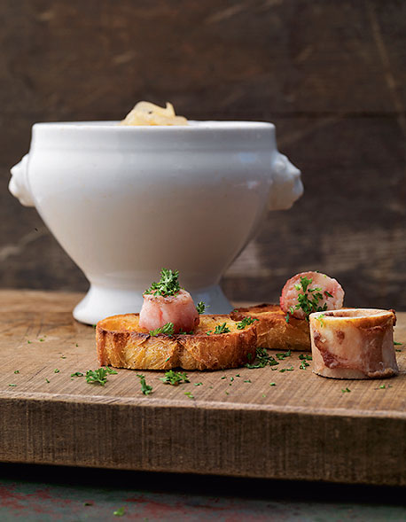 Zwiebelsuppe mit Kalbs-Markbein auf Toast