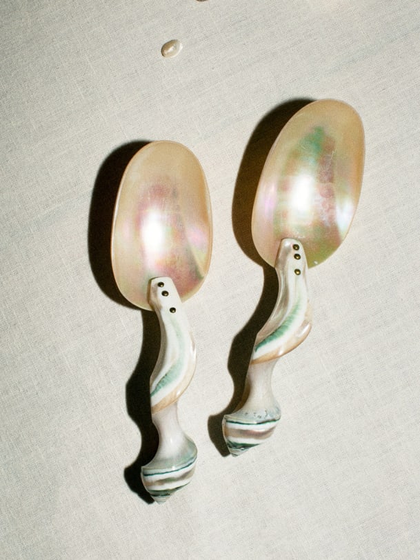 Für meine neue Lieblingsspeise brauche ich passende Löffel, die mein Fernweh ein bisschen erträglicher und die Mango ganz bestimmt noch leckerer machen. Die antiken Perlmuttlöffel mit einem gedrehten Muschelgriff (ca. 154 Fr.), die ich bei Bonadrag gefunden habe, könnten nicht besser passen – ich kann mich kaum daran sattsehen!