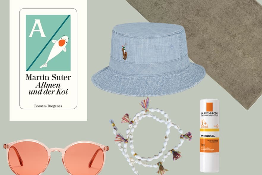 Brillenkette ca. 45 Fr.von Züri Müri; Frotteetuch ca. 70 Fr. von Globus; Roman "Allmen und der Koi" von Martin Suter ca. 34 Fr. bei Orell Füssli; Lipstick mit LSF 50+ von La Roche-Posay ca. 10 Fr. bei Shop-Apotheke; Sonnenbrille ca. 175 Fr. von Viu; Bucket Hat von Polo Ralph Lauren ca. 73 Fr. bei About You