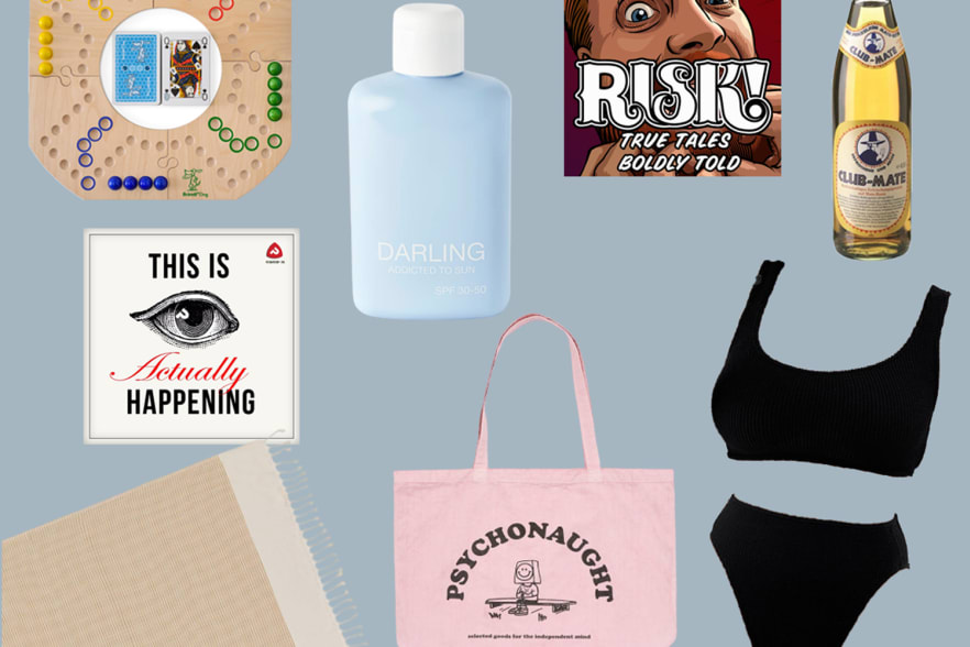 Crinkle-Bikinihose und Bikinitop, zusammen ca. 41 Fr. von Asos; Hammam-Badetuch ca. 35 Fr. von Urbanara; Podcasts "Risk" und "This Is Actually Happening"; Spiel "Brändi Dog" ca. 70 Fr. bei Galaxus; Sonnencrème von Darling ca. 30 Fr. bei Beauty Bay; Tote-Bag ca. 25 Fr. von Goodhood; Club-Mate-Eistee ca. 3 Franken
