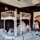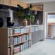 Weisse Hochglanz-Sideboards und Schiebevorhänge mit bunten Mustern.