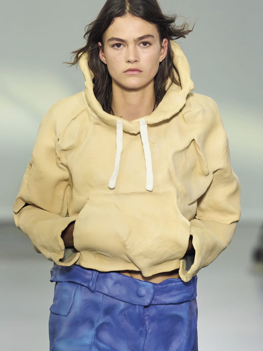 Für einen gemütlichen Abend auf dem Sofa eignen sich die Pieces von JW Anderson nur mässig – sie sind aus Plastilin. Die Knetmasse wurde im nordirischen Magherafelt hergestellt, dem Geburtsort des Designers. Wie kommt man auf Pullis, in die man gar nicht reinkommt? Das ist wahre Knetàporter, ein Showpiece nur für den Laufsteg. Gucci oder Courrèges präsentieren tragbarere Varianten.