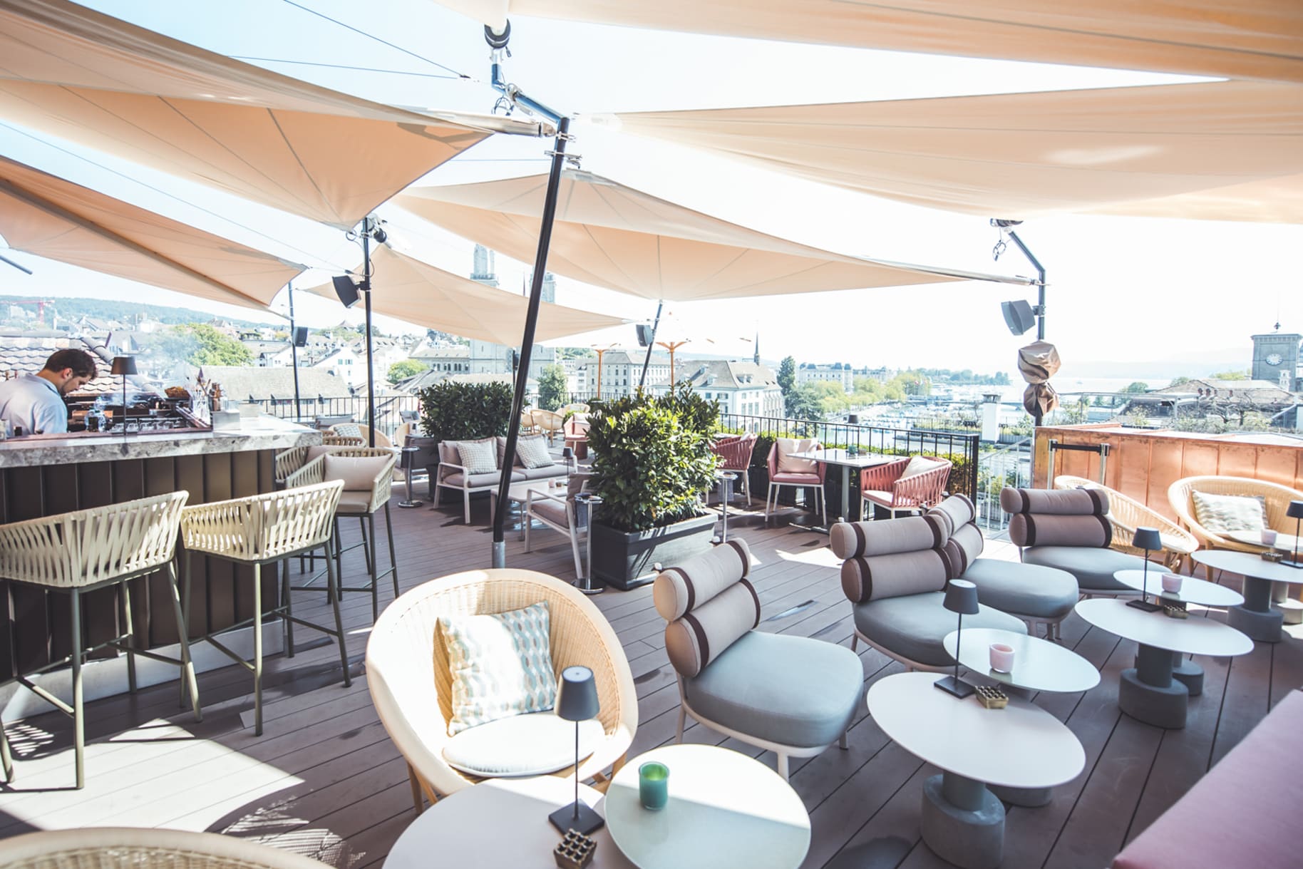 Diesen Vibe hat das Hotel: Kein Lärm aus der Stadt dringt in die Zimmer. Das Leben wogt an den Aussenseiten dieses Hauses – auf dem Dach etwa, wo man in der neuen und begehrten Bar The Nest über den Zürichsee bis in die Alpen blickt. Auf der Restaurantterrasse, die über dem Fluss zu schweben scheint, treffen sich die Hotelgäste zum Frühstück. Und vor dem Hoteleingang sitzen die Menschen an kleinen Hochtischen, schauen auf dem Fluss – und zwischen ihnen bewegt sich durch diesen einem schmalen Durchgang scheinbar ganz Zürich.