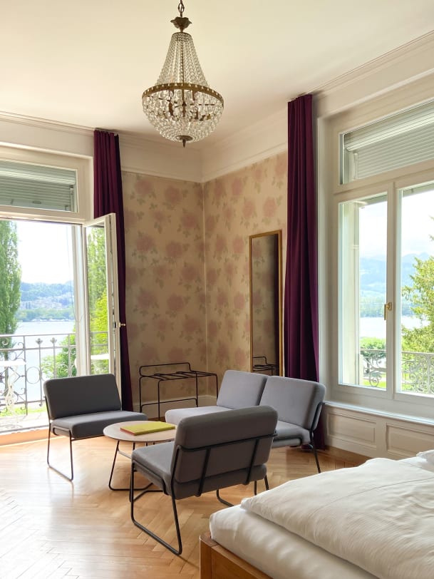 Instagrammable (von 1 bis 10): 7. Most instagrammable place im Hotel ist wohl das Eckzimmer im dritten Stock mit doppelter Seesicht und (fast) freiem Blick auf den Pilatus. Ausserdem der Kunstsalon im Parterre.