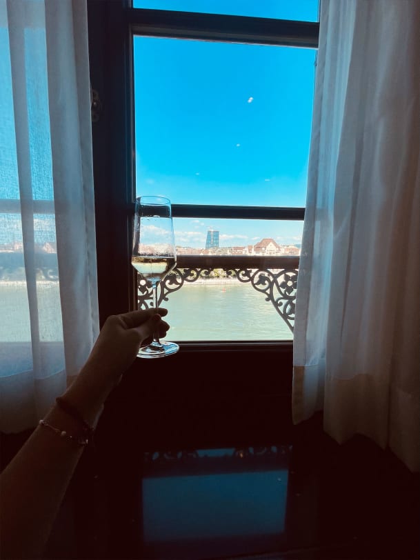 Mein Lieblingsort im Hotel: Die Badewanne im Badzimmer, die einen direkten Blick auf den Rhein ermöglichte – und casually noch einen kleinen TV-Bildschirm an der Wand hängen hatte. Dazu ein Glas Ruinart – Bade-Luxus vom Feinsten.
