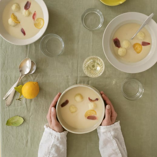 Kohler krönt die Erbsensuppe mit Buttermilchschaum, toppt die kalte japanische Gurkensuppe mit Fischtatar, streut knusprige Zwiebelringe auf die Apfel-Kartoffel-Suppe und last but not least pimpt er die traditionelle Mulligatawny-Suppe, die Miss Sophie in "Dinner for One" serviert wird, mit exotischen Früchten.