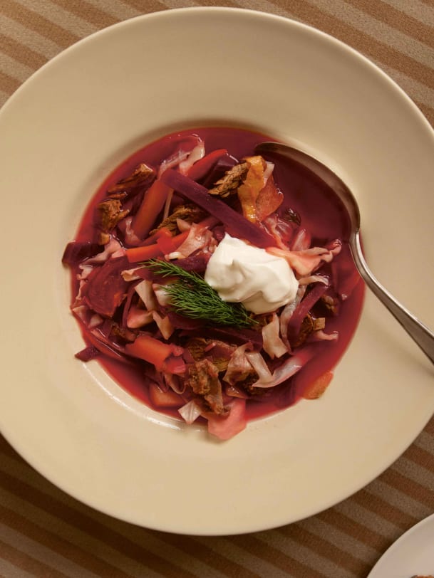 Ja, es braucht ziemlich viel Zeit, um diesen Borschtsch zu machen – aber das zarte, harmonische Ergebnis ist die Mühe wert: Das Fleisch ist butterzart, und wenn auch das Gemüse schön klein geschnippelt ist, kann die Suppe ohne Messer gelöffelt werden.