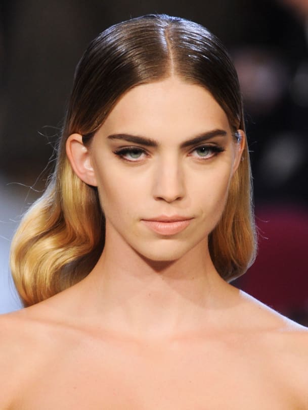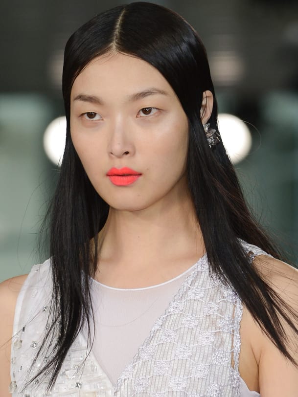 Schlicht und brav: An vielen Fashion Shows trugen Models einen exakten Mittelscheitel. Die seidig glatten Haare fielen ohne jeglichen Schnick-Schnack auf die Schultern.