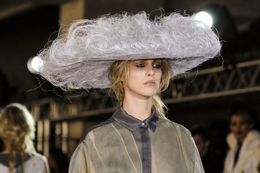 Eins waren die Kopfbedeckungen — Hüte kann man sie fast nicht nennen — auf jeden Fall nicht: klassisch. Farben, Formen und Materialien gingen weit auseinander. Am experimentellsten war wohl Jeremy Scotts Kombination von Leoprint-Pailletten Burka mit Hip-Hop-Ledercap.