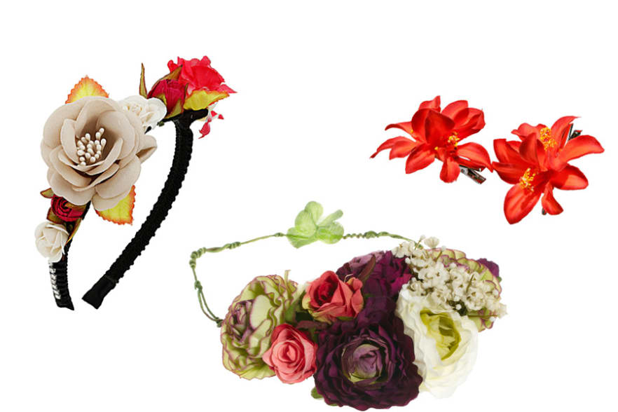 Blümenkränze (v.l.n.r.): Haarreif, ca. 20 Fr. von Topshop.com, Blumenkranz, ca. 41 Fr. von Asos.com, Haarclips, 4.90 Fr. von H&M