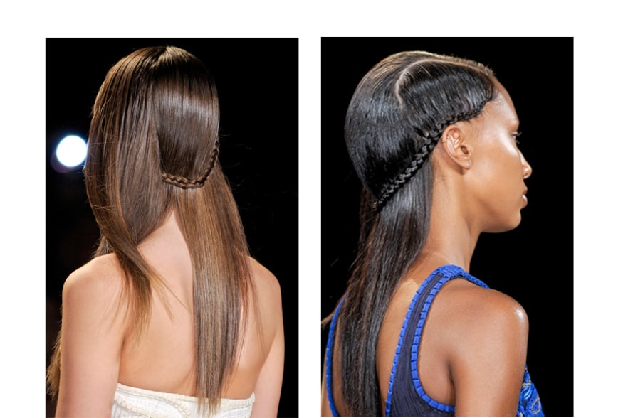 Bei Hérve Léger liessen sich die Friseure etwas Tolles einfallen: Ein Zöpfchen, von der Stirn her bis hinters Ohr französisch geflochten, danach normal gezöpfelt und unterm offenen Haar festgesteckt. Cooler Kontrast dazu: die streng geglätteten Haare.