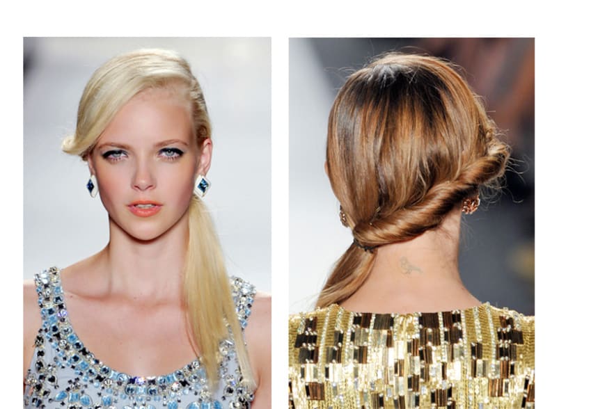 An der Fashionshow von Jenny Packham wurden die Models mit einem seitlichen Pferdeschwanz über den Laufsteg geschickt. Tiefer Seitenscheitel ziehen und von vorne her die Strähne zu einer Tolle einrollen, in regelmässigen Abständen feststecken und am seitlichen Nacken zum Pferdeschwanz binden.