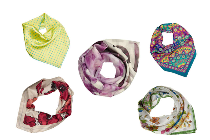 Seidentücher in diversen Farben: Gepunktetes Foulard von Passigatti, 23 Fr., Foulard mit roten Blumen von Barbour, 95 Fr., Tuch in Rosétönen von McQ Alexander McQueen, 200 Fr., Flower-Power-Tuch aus Seide von Passigatti, 65 Fr., Tuch mit Blumenprint und grünem Rand von Roeckl, 60 Fr., alle bei Zalando.ch