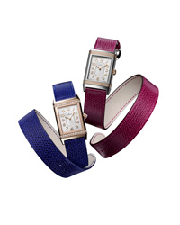 Jaeger-Le Coultre: Die Reverso ist die Ikone der Manufaktur aus Le Brassus: Zum 81. Geburtstag ist die Uhr mit dem genialen Dreh schlanker geworden und mit 7.17 Millimetern so dünn, dass sie sich mit Doppelschlaufe ums Handgelenk schmiegt. Neu sind die auswechselbaren farbigen Armbänder, die exklusiv aus den Ateliers des italienischen Nobel-Lederwarenherstellers Valextra stammen.
