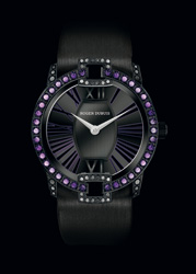 Roger Dubuis. Für die Velvet-Kollektion wurden violette Amethysten und Spinelle in Titan gefasst – Roger Dubuis ist überzeugt, dass "dieses Leichtmaterial in der Uhrenindustrie an Bedeutung gewinnt".