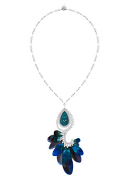 Harry Winston. Das hinter dickem Panzerglas gesicherte Necklace Ultimate Adornment ist ein Augenschmaus: Farblich abgestimmte Pfauenfedern, in der Fachsprache Plumasserie genannt, zieren das Zifferblatt. Das Collier besteht aus einer Serie von Hochkarätern, das gefiederte Diamantpendatif kann abgenommen und als Brosche getragen werden.