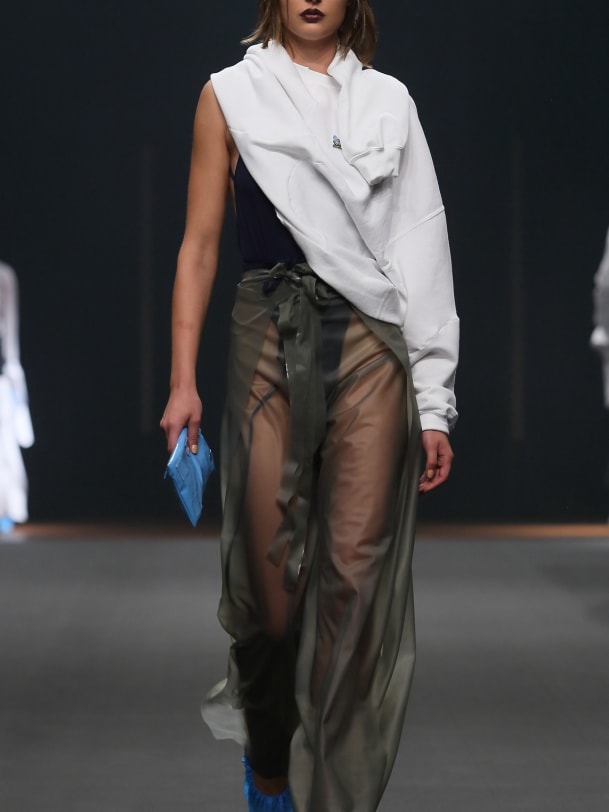 "Raffinierte Schnitte und eine Vielfalt an Materialien überzeugten mich in der Kollektion von Collective Swallow, hinter dem die Designer Ugo Pecoraio und Anaïs Marti stehen. Der Materialmix – mit Latexelementen als Highlight – war ein Hingucker und ein Statement in der schweizer Modebranche. Dank der übertriebenen Weite und den interessant verarbeiteten Schnitten ist eine Kollektion mit äusserst schönen Silhouetten entstanden. Einzig die Farbwahl – die Kombination von Gelb und Blau – überzeugte mich nicht. Mein Lieblingsoutftit der Collective Swallow Show ist deshalb ein Ton-in-Ton-Look, die verschiedenen Materialien sind trotz einheitlicher Farbe sehr schön zu erkennen."
