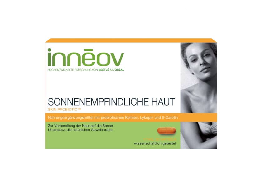 Mit den Nahrungsergänzungskapseln von Innéov für sonnenempflindliche Haut verkürzt sich die Regenerationsdauer der Haut nach UV-Strahlung von 10 auf vier Tage und die Haut weist somit weniger Unverträglichkeitsreaktionen auf (Packung zu 30 Kapseln für einen Monat für ca. 41 Franken).