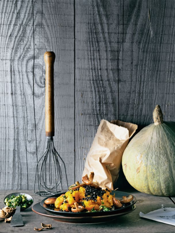 Kürbispüree mit Linsen und Pilzen