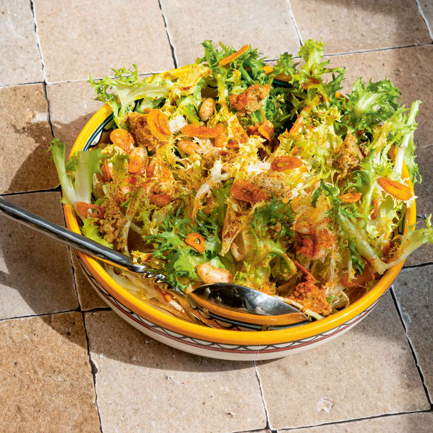 Friséesalat waschen und Strunk entfernen. Blätter auf einen flachen, grossen Teller geben. Weisse Bohnen auf dem Salat drapieren. Knoblauch in Scheiben schneiden und mit Olivenöl in einer Pfanne frittieren. Sobald er etwas Farbe annimmt, Paprikapulver dazugeben. Pfanne vom Herd nehmen und kurz stehen lassen. Salat mit Rotweinessig und einer Prise Salz würzen. Einige Löffel des veganen Thunfischs auf dem Salat verteilen. Knoblauch mit dem Olivenöl über den Salat geben.