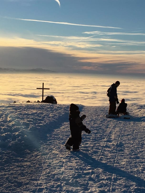 Über dem Nebelmeer: Sven Broder mit Kindern und Schlitten bei der Skihütte Rittmarren auf dem Ricken