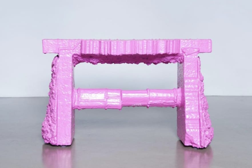 Natürlich handelt es sich hierbei weder um einen Stuhl noch um Schleim. Ich hätte diesen Beistelltisch aus Beton von Jonatan Nilsson (ca. 2025 Fr.) gerne neben meinem Bett als harte, aber lustige Schlafstätte für Bücher, Handy und Fusscrème. In ihn kann man nämlich so richtig reinträumen: Mal sieht er aus wie ein Haufen Popcorn, mal wie eine ASMR-worthy Fläche – als wäre ein Messer durch Butter geglitten –, mal wie ein Hybrid aus Ast und Rohr und mal scheint er noch immer vor Farbe zu triefen.