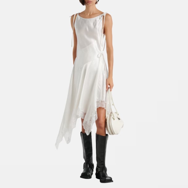 Ursprünglich hätte an dieser Stelle eine dieser XL-Aviator-Brillen gewünscht werden sollen. Eine Mittagspause lang liess ich mir dafür in einem Brillengeschäft Modell für Modell bringen, um Spiegelblick für Spiegelblick schmerzhaft zu realisieren: Die Sonnenbrille meiner Träume steht mir einfach nicht. Anders siehts mit dem Satin-Kleid von Acne (640 Fr., via Mytheresa) aus. Weisse Spitze und asymmetrischer Saum – voll mein Ding!