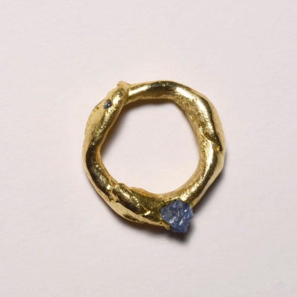 An meinen Fingern stecken fast ausschliesslich Ringe mit unfertigem Charakter. Obwohl tadellos geschliffener und auf Hochglanz polierter Schmuck eine höhere Goldschmiedleistung widerspiegelt, reizen mich Edelmetallstücke mit roher Oberfläche und flüchtigen Formen mehr. Sie erinnern mich daran, dass Makel und Eigenheiten die erzwungene Perfektion mit Spannung übertrumpfen. Mein nächster Reminder? Der Sapphire Ring (360 Fr.) des Schweizer Labels Sherylin Birth.