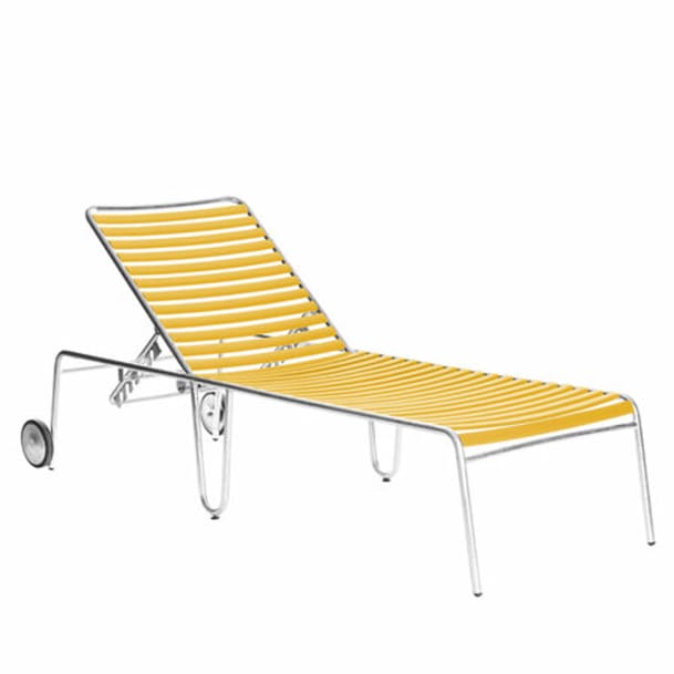 Die Bättig-Gartenliege ist ein Schweizer Design-Klassiker, der vom Label Manufakt nun wieder hergestellt wird – nach alter Tradition in Handwerksarbeit. Die sonnengelbe Version (ca. 2200 Fr.) würde sich ausnehmend gut auf meinem Balkon machen, für den stilvollen Müssiggang mit leichter Lektüre und kaltem Getränk.